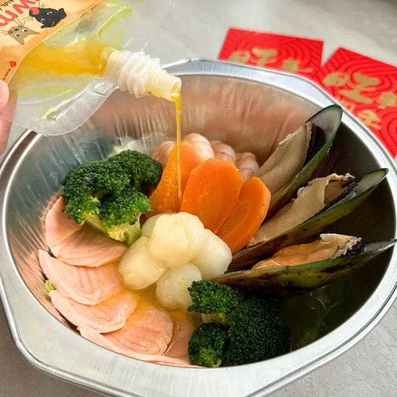 Step 2: Pour thawed broth into seafood bowl